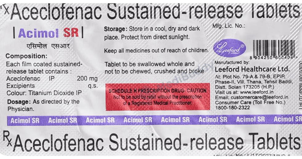 Acimol 200mg Tablet SR belongs to a group of medicines called nonsteroidal anti-inflammatory drugs (NSAIDs). It is used for short-term relief of pain, inflammation, and swelling in conditions that affect joints and muscles. It works by blocking chemical messengers in the brain that tell us we have pain. It can help relieve pain in conditions like rheumatoid arthritis and osteoarthritis.