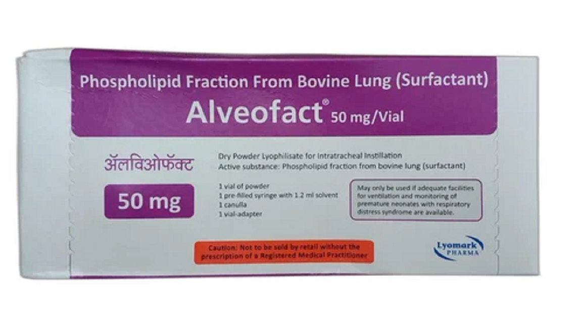 Alveofact 50mg Injection contains an active component called Phospholipid fraction from bovine lung. It is used as medication primarily in the treatment of respiratory distress syndrome (RDS) in premature infants. This condition occurs when the lungs don’t produce enough surfactant, a substance essential for maintaining the lungs’ elasticity and preventing alveoli collapse. In severe cases of pneumonia, especially in premature infants or newborns, where lung function is compromised, this medication might be used to support breathing. In some cases, this medication might assist with lung function when babies pass stool while still in the womb and inhale it into their lungs before or during delivery, causing breathing problems.