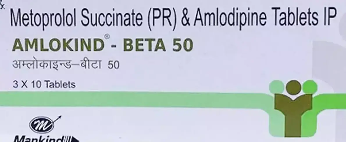 Amlokind BETA 50 Tablet contains Amlodipine and Metoprolol.