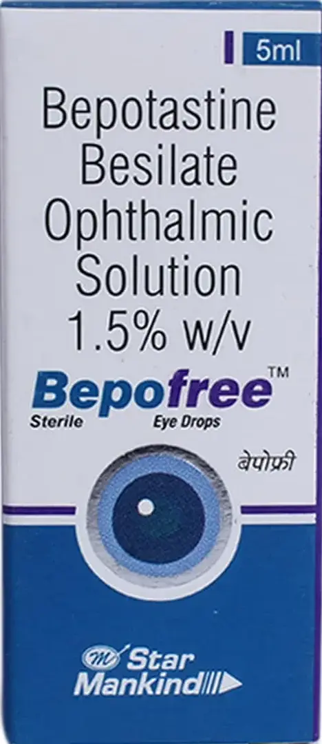 Bepofree Eye Drops 5 ML is an anti-allergic ophthalmic solution containing Bepotastine Besilate 1.5% w/v. It is used to relieve eye symptoms caused by allergies, such as itching, redness, watering, and swelling. The medicine works directly on the eyes to provide fast and effective relief from allergic conjunctivitis.