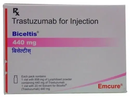 Biceltis 440mg Injection consists of Trastuzumab as an active constituent which is indicated for its use in HER 2 breast cancer. In HER 2 positive patients, the breast cancer cells are mostly composed of HER2 proteins that cause rapid development of cancer tumor by serving as a signal to the cancerous. This medication is also used to treat metastatic gastric cancer with increased levels of HER2 proteins.