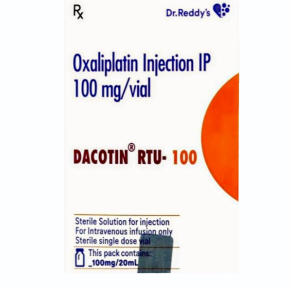 Dacotin RTU 100mg Injection belongs to the group of medications called platinum-based antineoplastic agents. It consists of the active ingredient Oxaliplatin. It is prescribed to treat stage 3 colon cancer after resectioning (surgical removal) of the primary tumor, metastatic colon and rectum cancer. It is used in combination with other anti-cancer medicines. Colorectal cancer is cancer that usually develops in the rectum and large intestine. It develops from the accumulation of various genetic mutations. Both environmental and genetic factors play a significant role in the origin of colorectal cancer. This medicine works against tumors that are resistant to cisplatin therapy.
