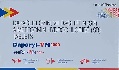 Daparyl VM 1000mg Tablet is a combination medicine formulated to manage type 2 diabetes mellitus effectively. It contains active ingredients that work together to lower high blood sugar by improving insulin sensitivity, reducing glucose production in the liver, and enhancing glucose utilization in the body. This helps in achieving better glycemic control and reducing the risk of long-term diabetes complications such as kidney, nerve, and heart problems.
