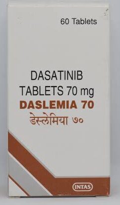 Daslemia 70mg Tablet consists of the active ingredient Dasatinib. It is prescribed for adults and children above one year of age with Chronic Myeloid Leukemia. This medicine is used to treat newly diagnosed Philadelphia chromosome-positive (Ph+) chronic myeloid leukemia (CML) in the chronic phase and Ph+ acute lymphoblastic leukemia in patients resistant to other therapies. Chronic Myeloid Leukemia refers to a type of blood cancer that makes the body produce too many white blood cells that happen due to alteration in the Philadelphia chromosome. Acute Lymphoblastic Leukemia is the most common form of blood cancer that affects children. In this case, the lymphocytes of white blood cells multiply too quickly and live too long.