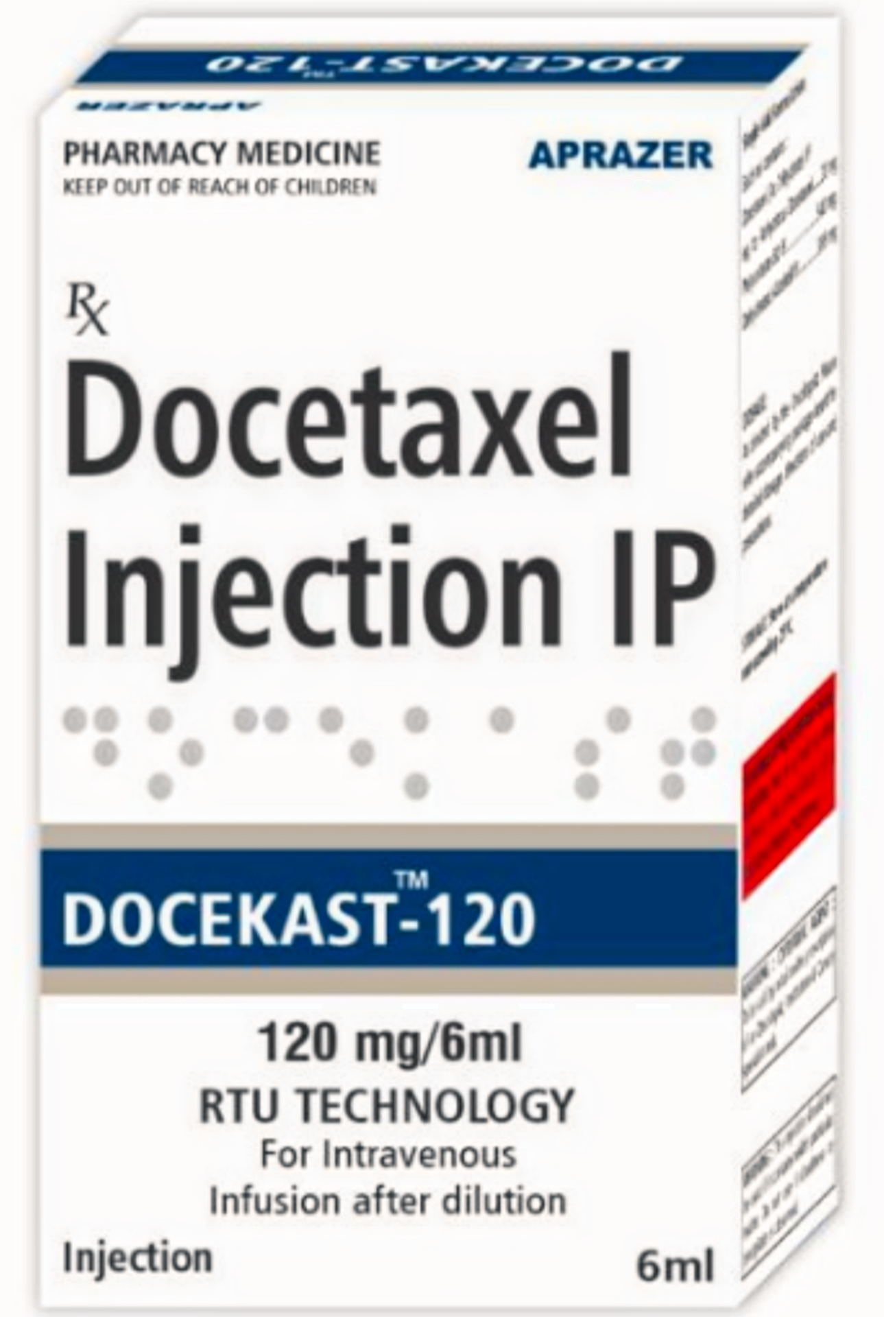 Docekast 120mg RTU Injection belongs to the class of anticancer medications known as taxoids. It contains the active constituent Docetaxel indicated to treat breast, prostate, non-small cell lung, stomach, and head and neck cancer. Cancer is a disease in which cells multiply in an uncontrolled and abnormal manner. This chemotherapy medication is used alone or in combination with other anticancer medicines.