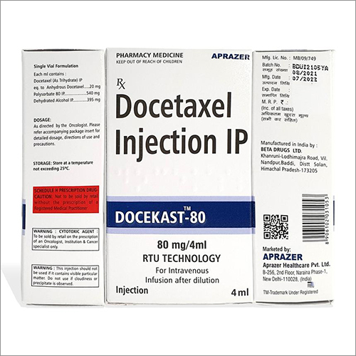 Docekast 80mg RTU Injection belongs to the class of anticancer medications known as taxoids. It contains the active constituent Docetaxel indicated to treat breast, prostate, non-small cell lung, stomach, and head and neck cancer. Cancer is a disease in which cells multiply in an uncontrolled and abnormal manner. This chemotherapy medication is used alone or in combination with other anticancer medicines.