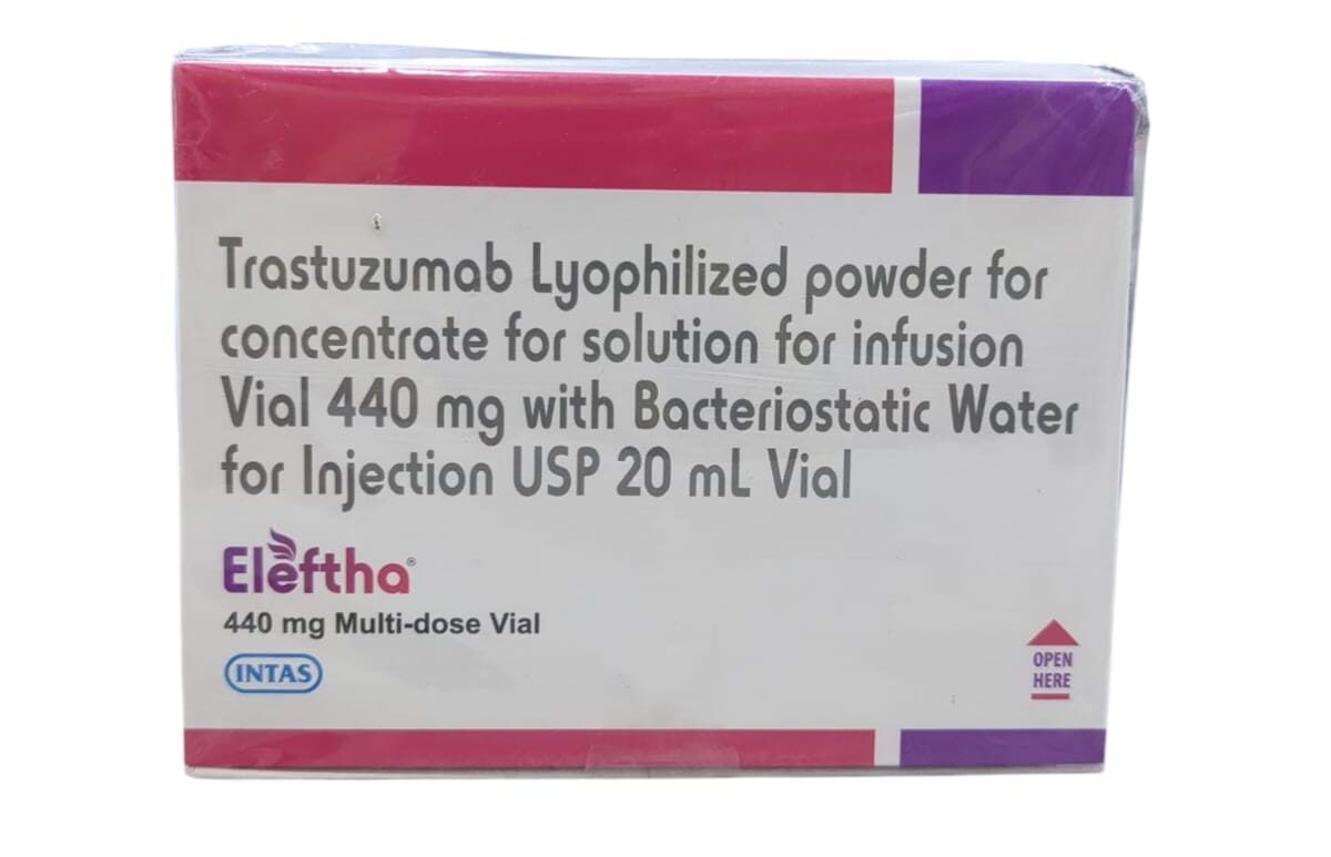 Eleftha 440mg Injection consists of Trastuzumab as an active constituent which is indicated for its use in HER 2 breast cancer. In HER 2 positive patients, the breast cancer cells are mostly composed of HER2 proteins that cause rapid development of cancer tumor by serving as a signal to the cancerous. This medication is also used to treat metastatic gastric cancer with increased levels of HER2 proteins.