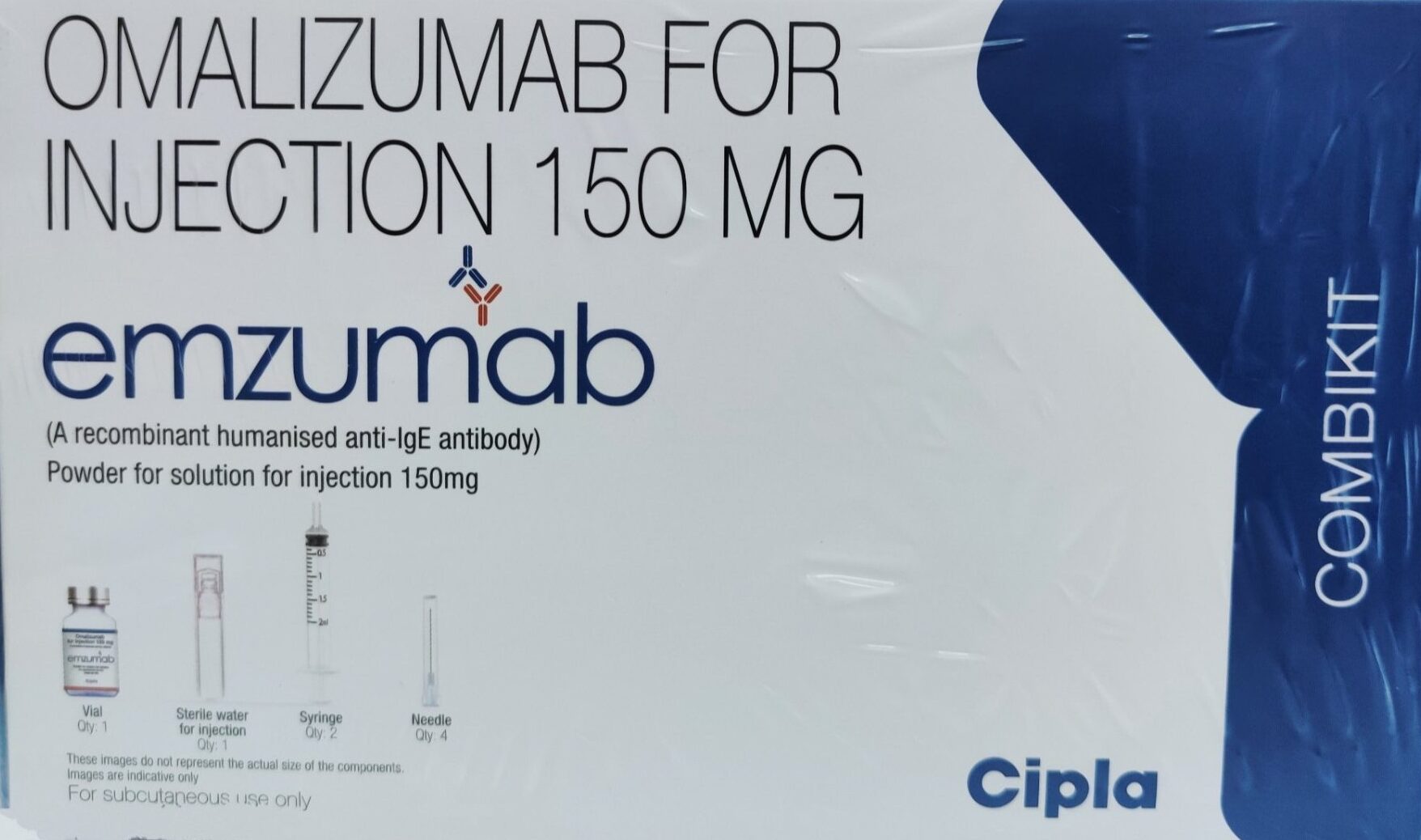 Emzumab 150mg combikit injection works by blocking and targeting a substance called immunoglobulin E (IgE) in the body; in this way, it reduces allergic reactions like Chronic rhinosinusitis (inflammation of the nose and sinuses) with nasal polyps and chronic spontaneous urticaria (CSU).