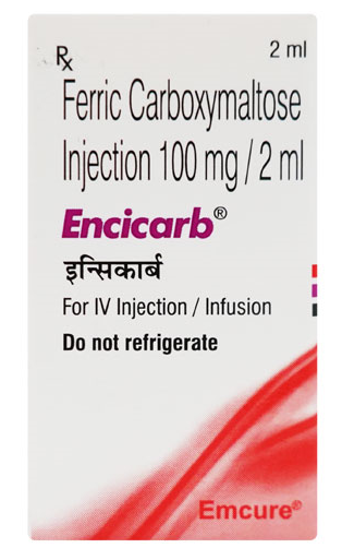 Encicarb 100mg Injection contains the active substance Ferric carboxymaltose. It belongs to the group of medications called iron replacement products. It is used to treat iron-deficiency anemia (decreased RBC due to lower levels of iron in the body) in adults and pediatric patients who cannot tolerate oral iron or when oral iron supplements are ineffective. It is also indicated to treat iron deficiency anemia in adults with chronic kidney disease who are not on dialysis. This medicine is not recommended for pediatric patients less than one year of age.