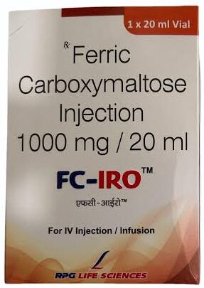 Fc-Iro 1000mg Injection contains the active substance Ferric carboxymaltose. It belongs to the group of medications called iron replacement products. It is used to treat iron-deficiency anemia (decreased RBC due to lower levels of iron in the body) in adults and pediatric patients who cannot tolerate oral iron or when oral iron supplements are ineffective. It is also indicated to treat iron deficiency anemia in adults with chronic kidney disease who are not on dialysis. This medicine is not recommended for pediatric patients less than one year of age.