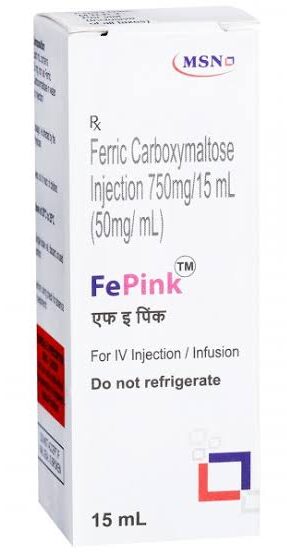 Fepink 100mg Injection contains the active substance ferric carboxylmaltose. It belongs to the group of medications called iron replacement products. It is used to treat iron-deficiency anemia (decreased RBC due to lower levels of iron in the body) in adults and pediatric patients who cannot tolerate oral iron or when oral iron supplements are ineffective. It is also indicated to treat iron deficiency anemia in adults with chronic kidney disease who are not on dialysis. This medicine is not recommended for pediatric patients less than one year of age.