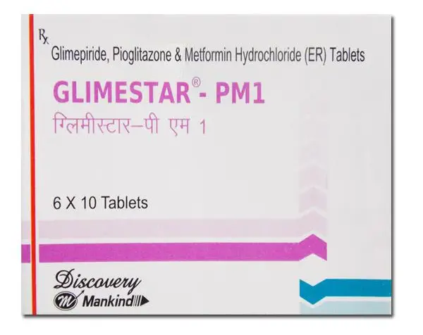 Glimestar PM1 Tablet is a combination of three antidiabetic medicines: Glimepiride, Metformin and Pioglitazone. They work by different mechanisms to provide better control of blood sugar when single or dual therapy is not effective. Glimepiride is a sulfonylurea which works by increasing the amount of insulin released by the pancreas in order to lower the blood glucose. Metformin is a biguanide. It works by lowering glucose production in the liver, delaying glucose absorption from intestines and increasing the body’s sensitivity to insulin. Pioglitazone is a thiazolidinedione which further increases insulin sensitivity.