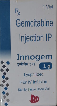 Innogem 1000mg Injection is a chemotherapy medication containing the active ingredient gemcitabine. It is used to treat bladder cancer, breast cancer, ovarian cancer, pancreatic cancer, and non-small cell lung cancer. Cancer is a disorder in which cells multiply in an uncontrolled and abnormal manner. Talk to your doctor if you have heart disease, liver disorders, kidney disorders, recently had radiotherapy, or vaccinated before taking this medicine.