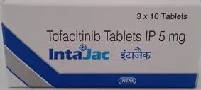 Intajac 5mg Tablet 10’s contains the active substance Tofacitinib. It is a disease-modifying anti-rheumatoid drug (DMARDs) that belongs to the class immunomodulators. It is used alone or with other medications to treat rheumatoid arthritis (A condition in which the body attacks its joints, causing pain, swelling, and loss of function) in adults who are unable to take or do not respond to other medications. It is also used to treat psoriatic arthritis (A condition that causes joint pain and swelling, and scales on the skin). It is also indicated for treating adult patients with moderately to severely active ulcerative colitis.