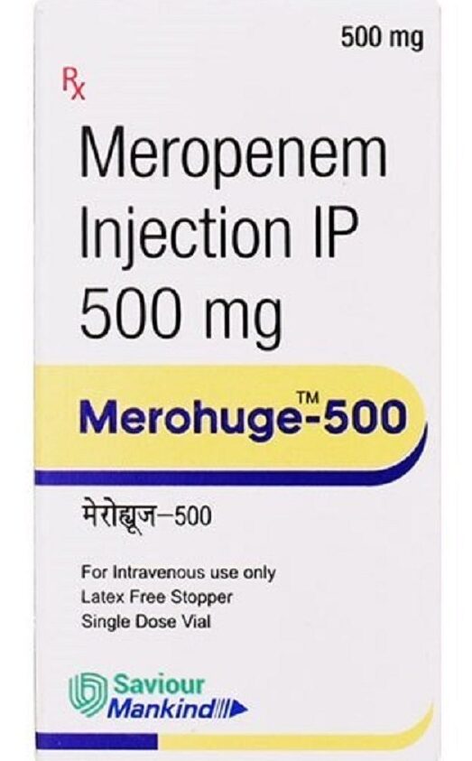 Merohuge 500mg Injection belongs to a group of medicines called carbapenem antibiotics. It works by killing bacteria which can cause serious infections. It is a versatile medicine used to treat many different types of bacterial infections such as infections of the brain (meningitis), lungs (pneumonia), abdomen, urinary tract, skin, blood, and heart. This medicine is usually given as an injection by a doctor or nurse.
