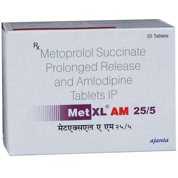 Met XL AM 25/5mg Tablet contains two medicines, both of which help to control high blood pressure and heart rate. It is also used for heart-related chest pain (angina), abnormal heart rhythms and chronic (long-term) heart failure.