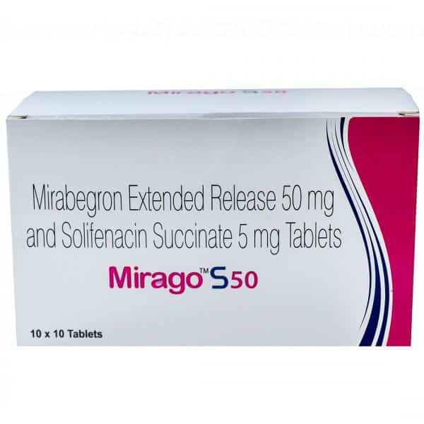 Mirago S 50mg Tablet contains two active ingredients called as Mirabegron and Solifenacin. It belongs to the family of Beta 3-adrenoceptor agonists and muscarinic receptor antagonists. This medicine reduces the activity and symptoms associated with an overactive bladder, such as urgency incontinence (inability to control bladder emptying), sudden urination urges, and increased urinary frequency. This medicine is not advised to use in children under 18 years old.