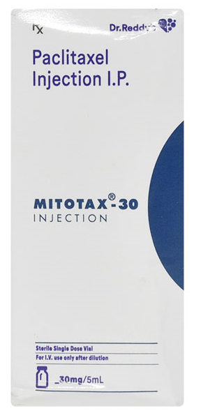 Mitotax 30mg Injection is an anticancer medicine. It treats breast cancer, non-small cell lung cancer, ovarian cancer, and AIDS (Acquired Immuno-Deficiency Syndrome). Cancer is a condition in which cells are dividing and growing fast and in an uncontrolled manner. This Injection may be given alone or in combination with other anticancer medicines. It should not be used for severe liver problems, uncontrolled infection, and low white blood cell or platelet count.
