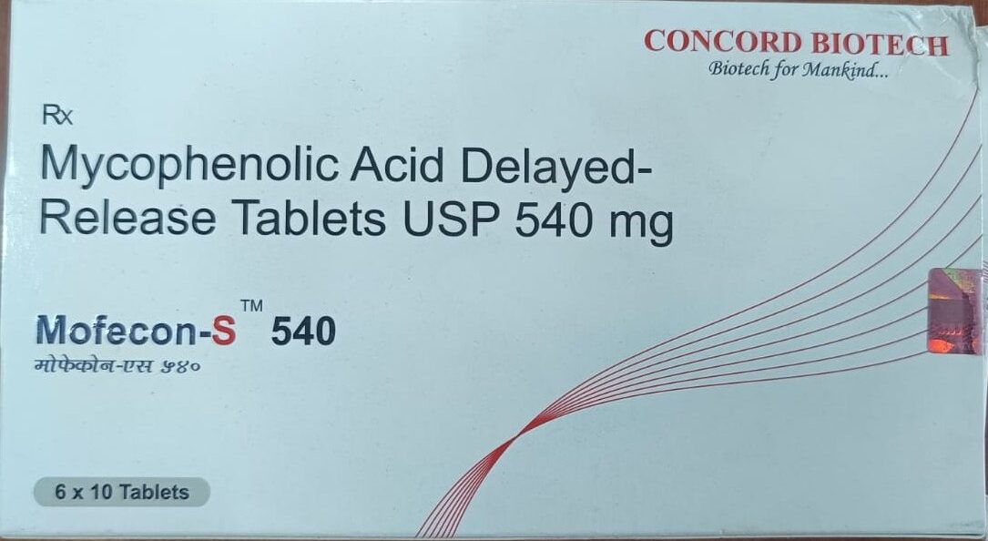 Mofecon S 540mg Tablet is an immunosuppressant with an active ingredient called Mycophenolate sodium. It belongs to the inosine monophosphate dehydrogenase (IMPDH) inhibitor category. This medicine is used to prevent organ rejection in individuals who have previously received an organ transplant (such as kidney, heart, or liver transplantation). It is prescribed as part of a combination therapy that includes other immunosuppressive drugs.