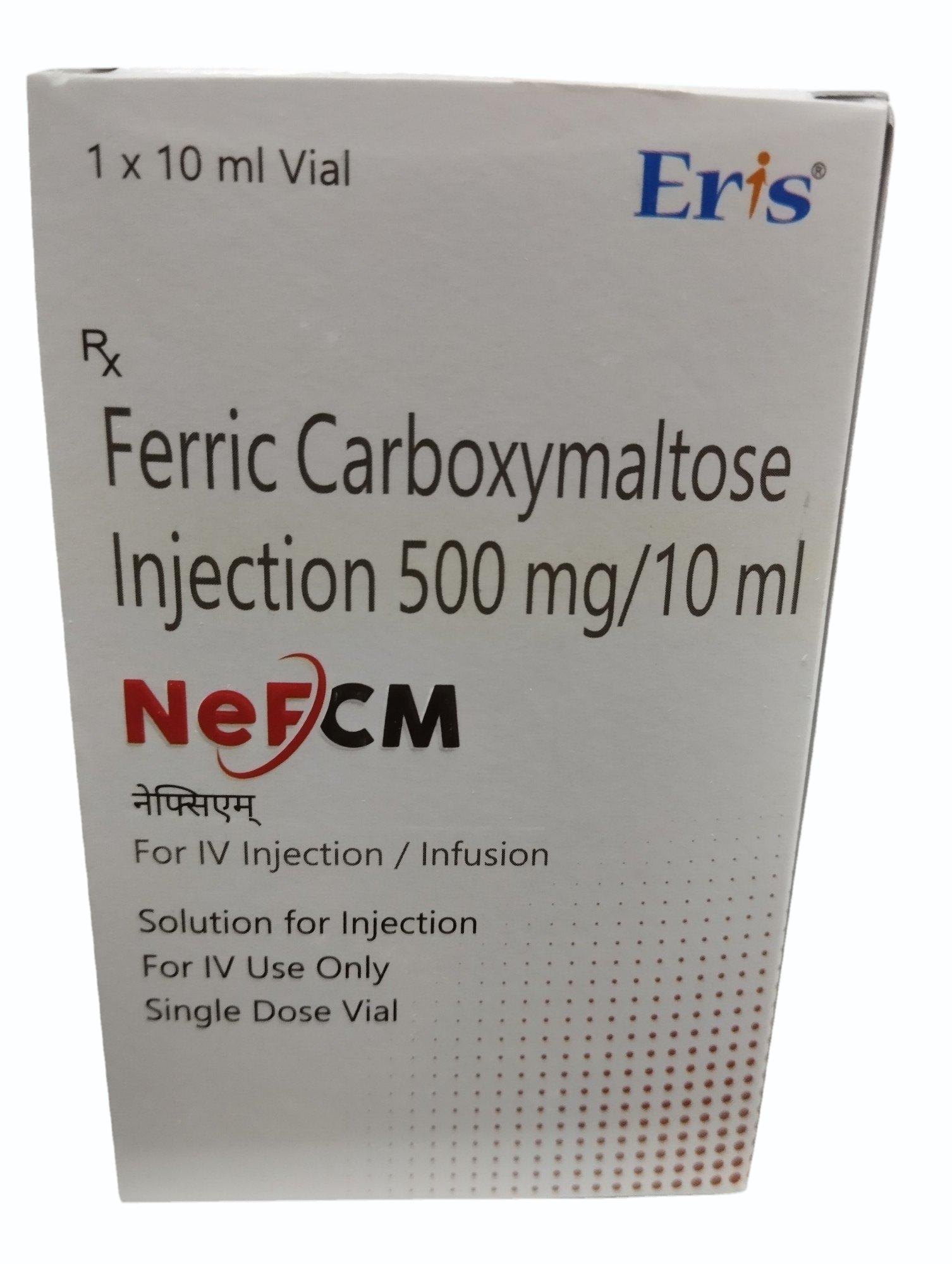Nefcm 500mg Injection contains the active substance ferric carboxylmaltose. It belongs to the group of medications called iron replacement products. It is used to treat iron-deficiency anemia (decreased RBC due to lower levels of iron in the body) in adults and pediatric patients who cannot tolerate oral iron or when oral iron supplements are ineffective.