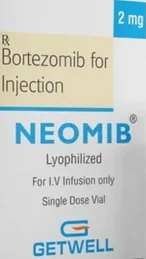Neomib 2mg Injection is a chemotherapy medication that belongs to the class of medicines called proteasome inhibitors. It consists of the active ingredient Bortezomib. It is indicated for the treatment of multiple myeloma and mantle cell lymphoma. Multiple myeloma refers to the cancerous progression of plasma cells that are predominant in the bone marrow. Mantle cell lymphoma is a less common cancer affecting the lymph nodes. This medication is concomitantly used with other chemotherapy medicines like pegylated liposomal doxorubicin, rituximab, cyclophosphamide, doxorubicin, dexamethasone, prednisolone or thalidomide for patients who have not started treatment and are ineligible for blood stem cell transplant.