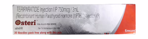 Osteri 750mcg Injection contains the active component as Teriparatide. Osteri 750mcg injection, a synthetic version of parathyroid hormone (PTH) produced by the parathyroid glands, is employed for treating osteoporosis. Osteoporosis is a condition marked by weakened bones, heightening the likelihood of fractures. Fractures caused by osteoporosis can severely affect an individual’s quality of life, causing pain and restricting mobility.