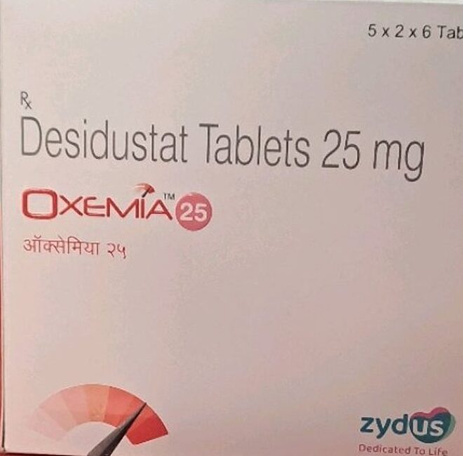 Oxemia 25mg Tablet is an erythropoiesis-stimulating agent that contains an active ingredient called Desidustat. It belongs to the medication class known as hypoxia-inducible factor-prolyl hydroxylase (HIF-PH) inhibitor. It is used to treat anemia in patients with chronic kidney disease.