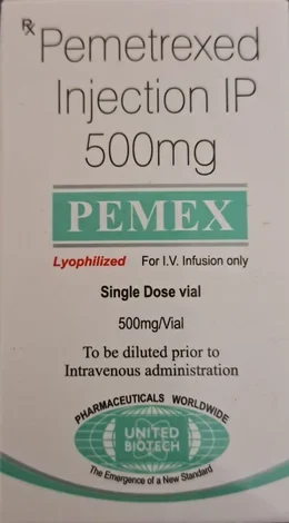 Pemex 500mg Injection is an anticancer medicine containing the active ingredient Pemetrexed. It belongs to the medication class known as an antifolate agent. It is used to treat non-small cell lung cancer and malignant pleural mesothelioma (cancers of the lungs and chest). This medicine is given alone or in combination with another anticancer medicine, such as cisplatin. Your doctor may prescribe corticosteroids, folic acid, and vitamin B12 to limit the side effects.