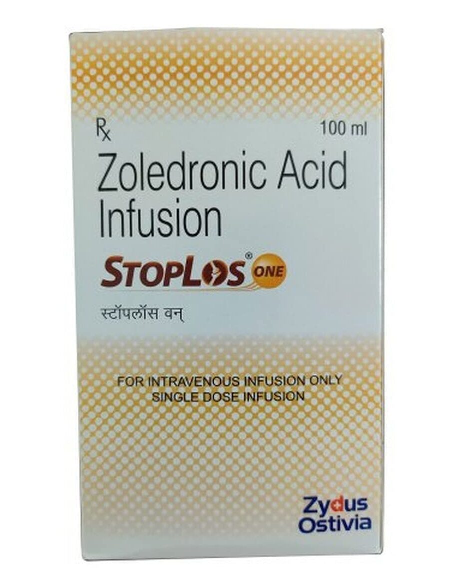 Stoplos One 5mg Injection contains the active substance zoledronic. It belongs to the group of substances called bisphosphonates. It is used to reduce the amount of calcium in the blood in adult patients where it is too high due to the presence of a tumor. Tumors can accelerate normal bone change in such a way that the release of calcium from bone is increased. This condition is known as tumor-induced hypercalcemia (TIH). It is also used to prevent bone complications in adult patients with multiple myeloma and bone metastases from solid tumors (spread of cancer from the primary site to the bone), in addition to standard cancer therapy.