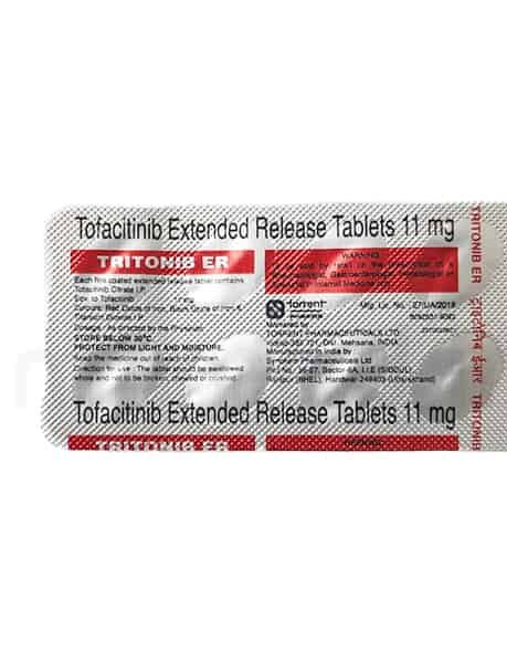 Tritonib ER 11mg Tablet contains the active substance tofacitinib. It is a disease-modifying anti-rheumatoid drug (DMARDs) that belongs to the class immunomodulators. It is used alone or with other medications to treat rheumatoid arthritis (A condition in which the body attacks its joints, causing pain, swelling, and loss of function) in adults who are unable to take or do not respond to other medications. It is also used to treat psoriatic arthritis (A condition that causes joint pain and swelling, and scales on the skin). It is also indicated for treating adult patients with moderately to severely active ulcerative colitis.