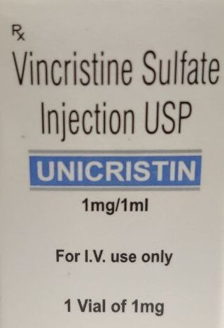 Unicristine 1mg Injection is a chemotherapy medication containing the active constituent Vincristine sulphate. This medication belongs to a class of drugs called vinca alkaloids, which inhibit the growth of cancer cells. It treats blood, head, breast, neck, kidney, bone, or lung cancers. It is used in treating rhabdomyosarcoma (cancer that affects muscle tissue) and neuroblastoma (cancer that develops from immature nerve cells). It may also be used to treat multiple myeloma (cancer of plasma cells), thyroid cancer, and a blood disorder known as idiopathic thrombocytopenic purpura (ITP). Cancer is a disorder in which cells multiply in an uncontrolled and abnormal manner.