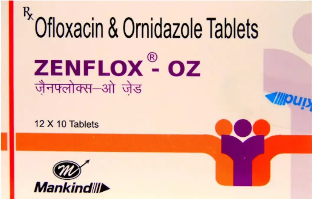 Zenflox OZ Tablet is a prescription medicine used to treat bacterial infections and gastrointestinal discomfort. It combines two active ingredients: Ofloxacin 200 mg, an antibiotic that fights bacterial infections, and Ornidazole 500 mg, which targets protozoal infections and anaerobic bacteria. This combination helps effectively manage infections of the stomach, intestines, urinary tract, and other bacterial infections.