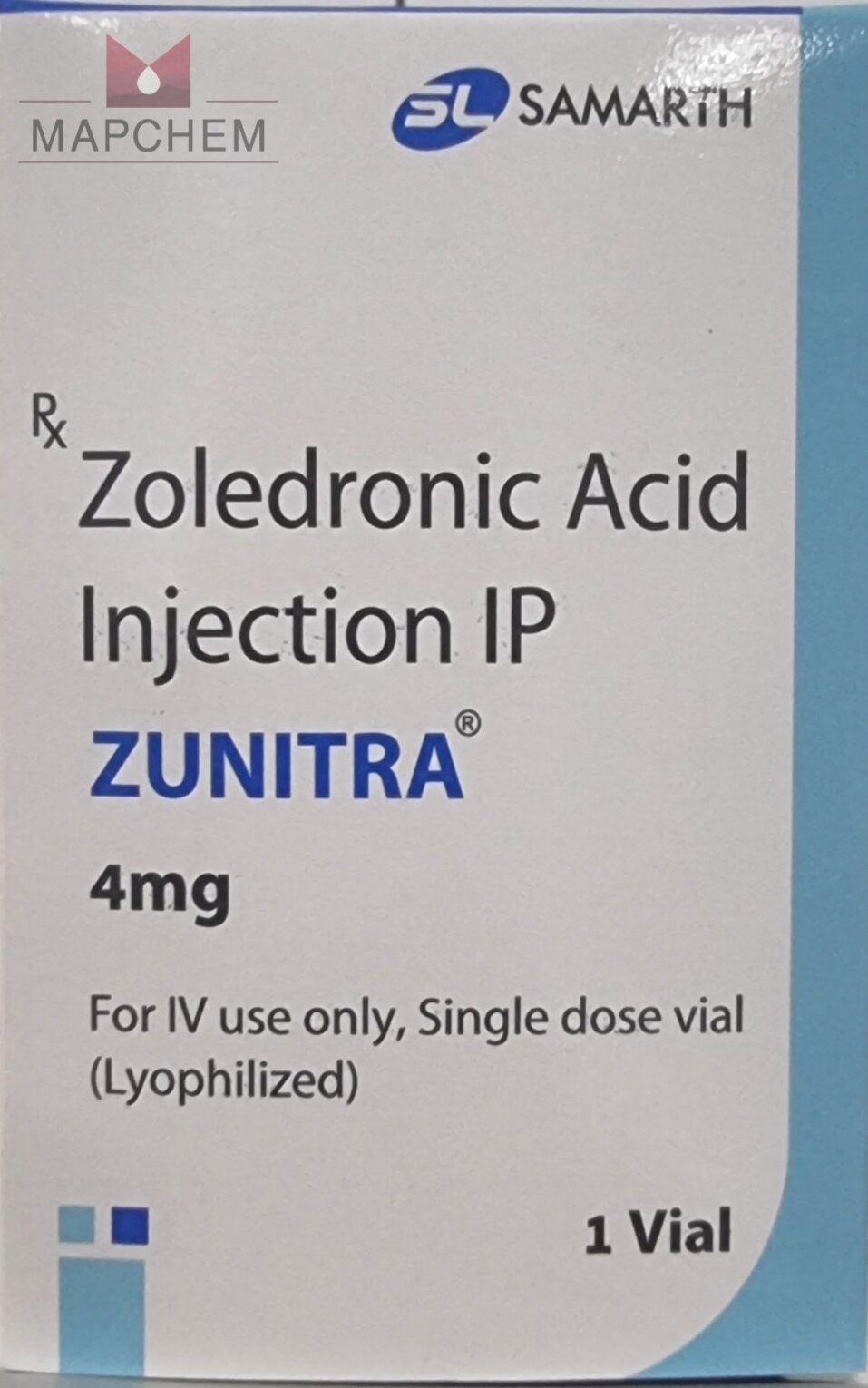 Zunitra 4mg is also indicated to prevent or treat osteoporosis (a condition in which the bones become thin and weak and break easily) in women who have undergone menopause. It is also used to treat osteoporosis in men. It is used to treat Paget’s disease of bone (a condition in which the bones are soft and weak and may be deformed, painful, or easily broken). Other uses include treating or preventing osteoporosis in men and women taking glucocorticoids (a corticosteroid medication that may cause osteoporosis).